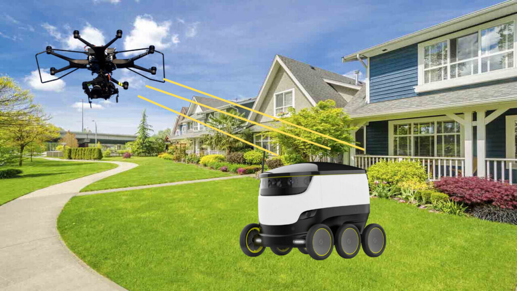 Un robot de entrega puede ser detenido por una barricada o una puerta cerrada en la residencia de un cliente. En respuesta, se comunica con un dron y le indica que recupere el artículo utilizando un «mecanismo de agarre» y luego complete la entrega volando hacia el cliente.